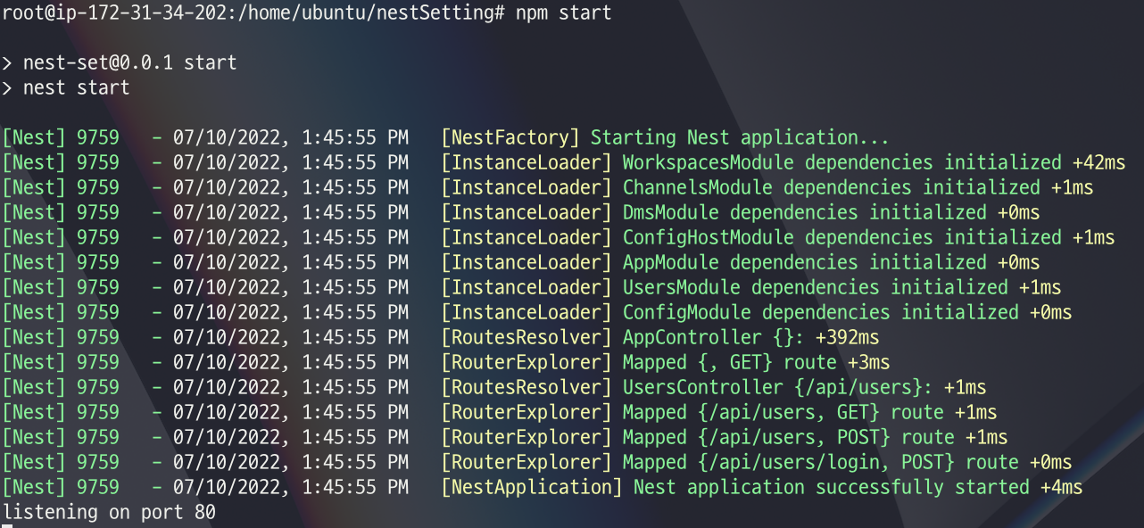 리눅스 환경에서 nestjs로 만든 서버를 80번 포트를 사용해서 시작을 했다.