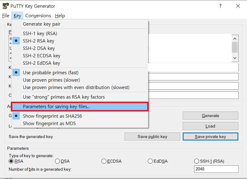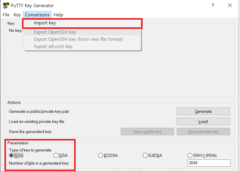 3. Parameters를 RSA로 설정 / 상단 Conversions에서 import key 클릭 및 변환하고자 하는 키 클릭